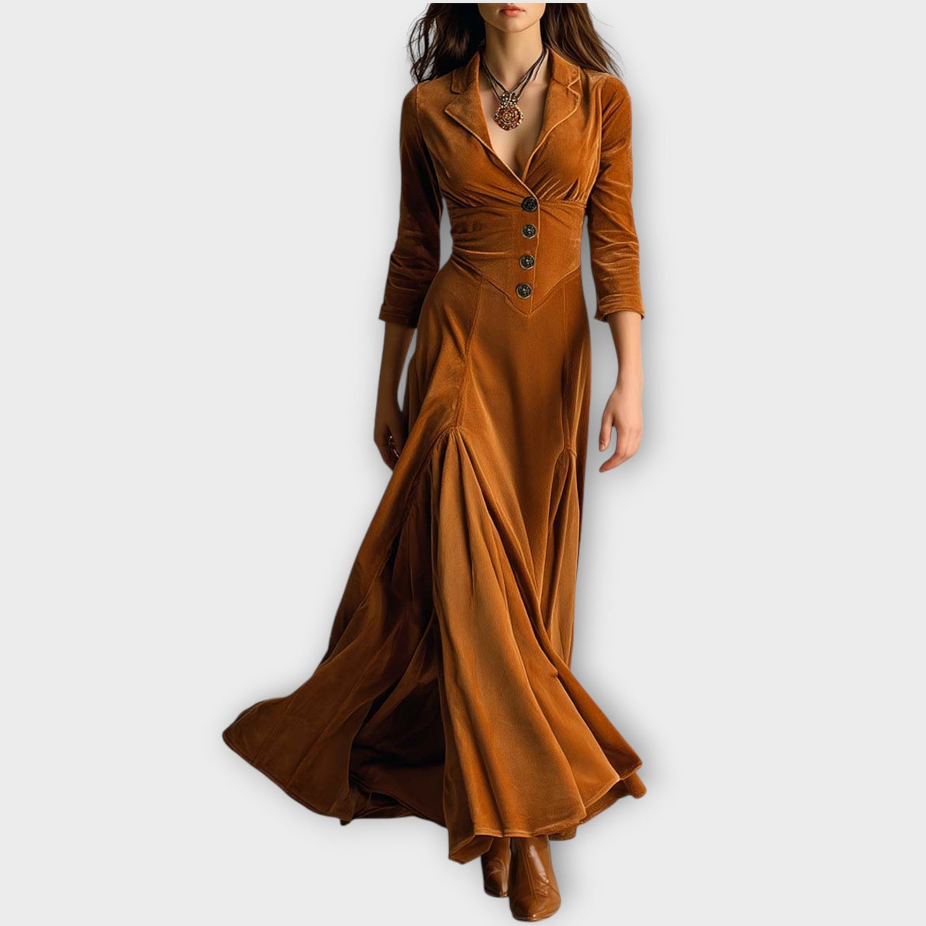 Embrace timeless romance with this vintage-inspired velvet maxi dress, designed with a flattering fitted waist and dramatic flowing skirt. The buttoned bodice and tailored lapel collar add a refined touch, making it perfect for autumn events, evening gatherings, or elegant everyday wear.