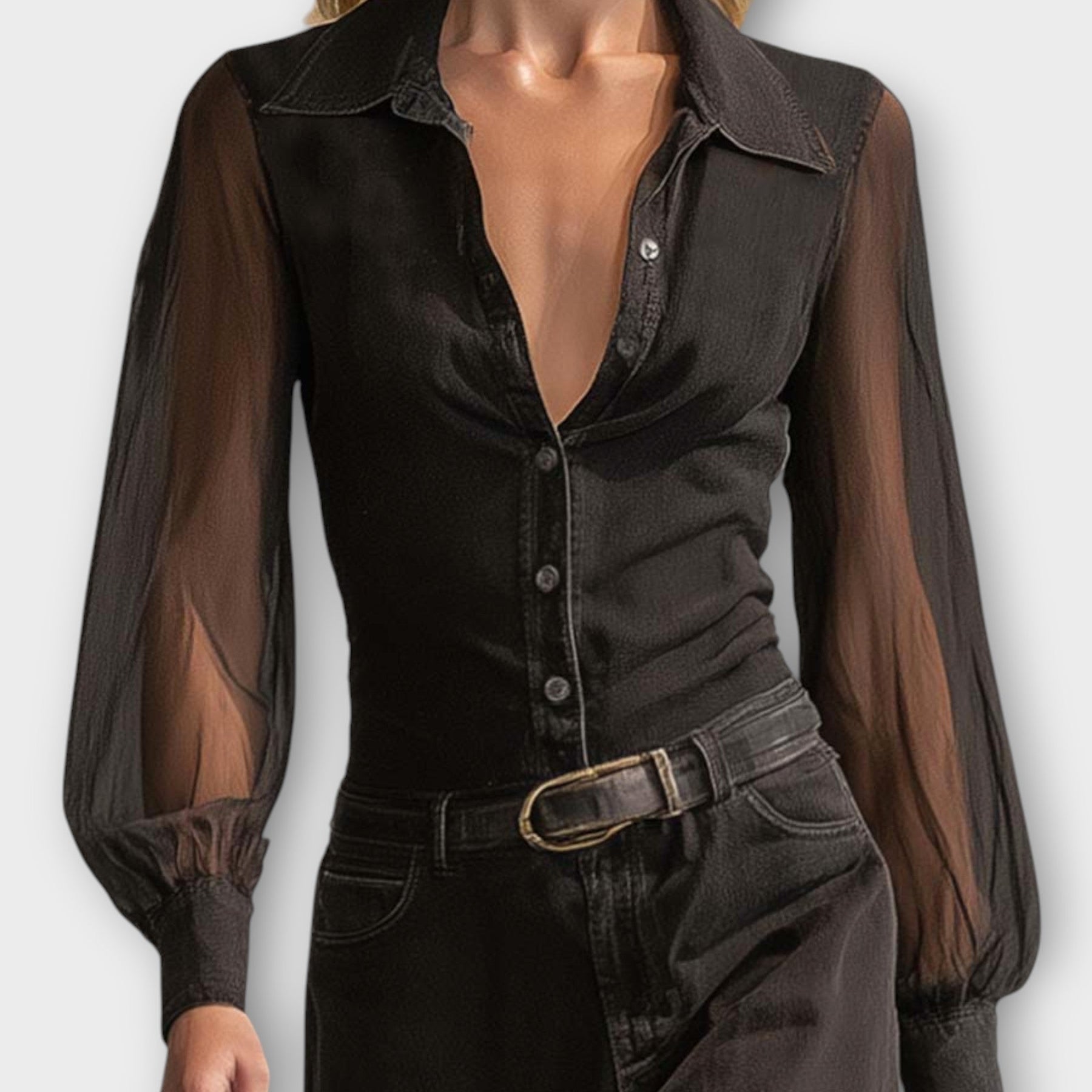 • Elegant sheer bishop sleeves that add an airy, romantic edge to the structured silhouette