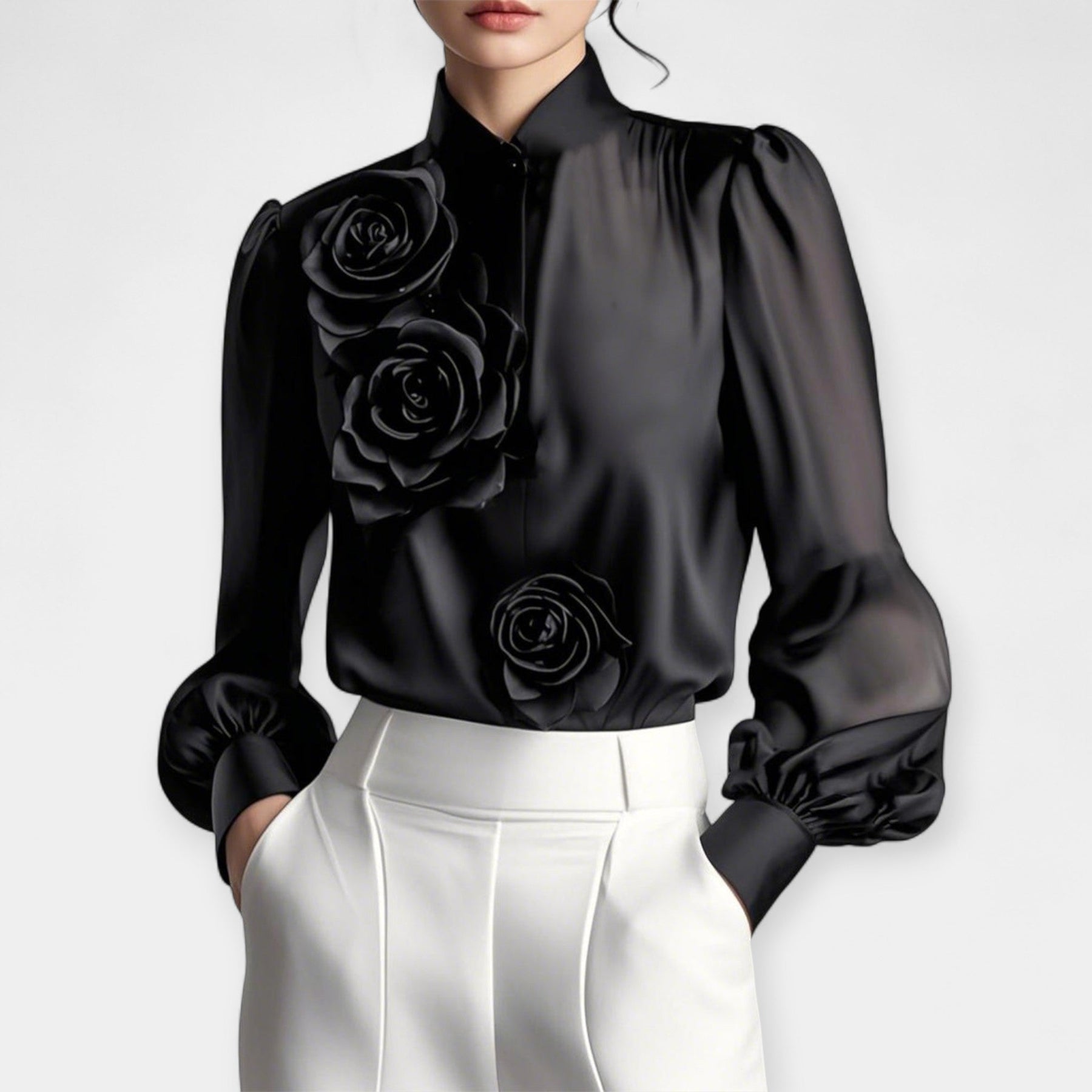 This white blouse with stunning 3D rose appliqués elevates your style with a touch of romance and luxury. The high collar and subtly sheer fabric provide an airy, sophisticated silhouette, perfect for pairing with tailored trousers or skirts.