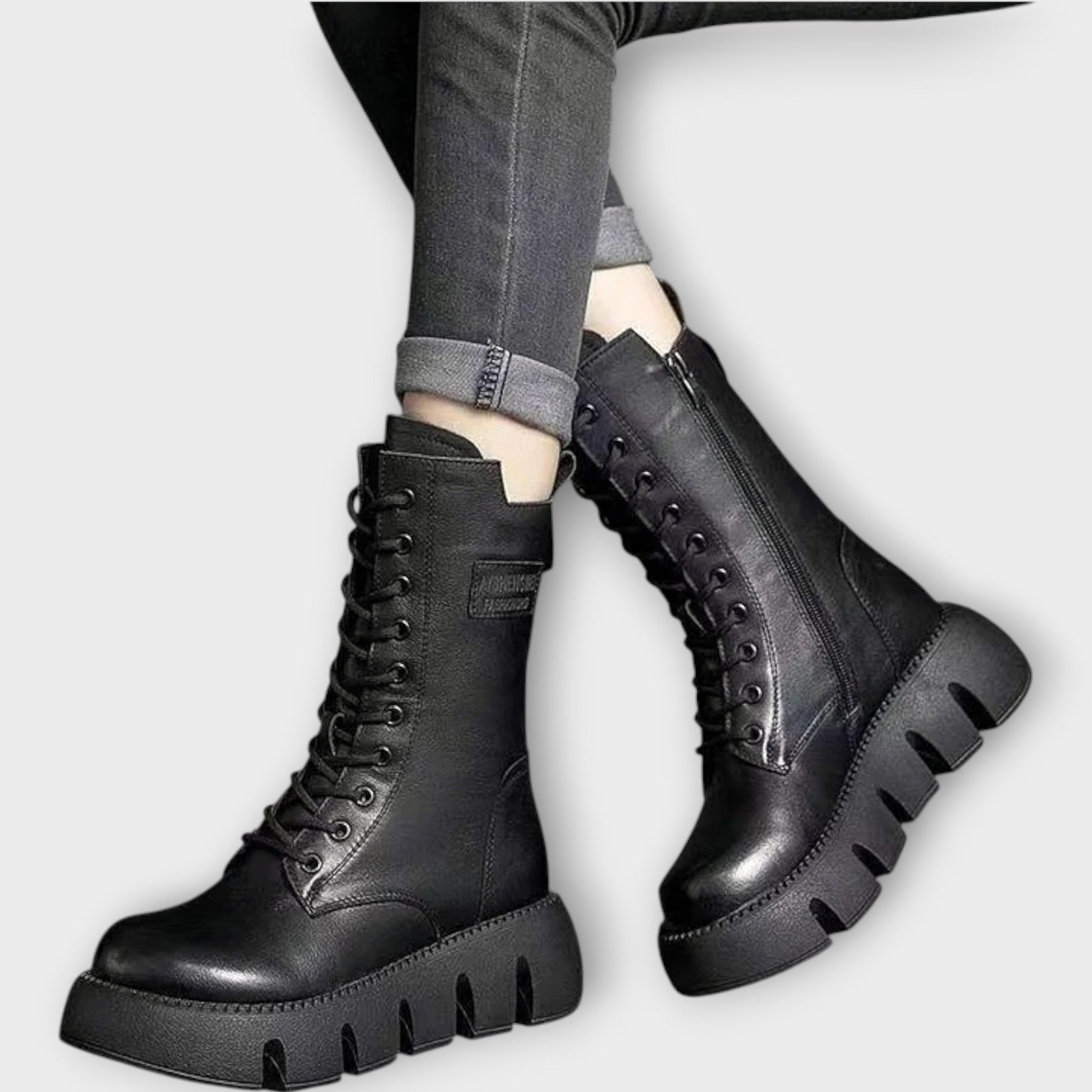 Step out with confidence in these bold combat boots designed for both power and comfort. Their statement sole and sleek design make them a perfect mix of edgy fashion and all-day wearability.