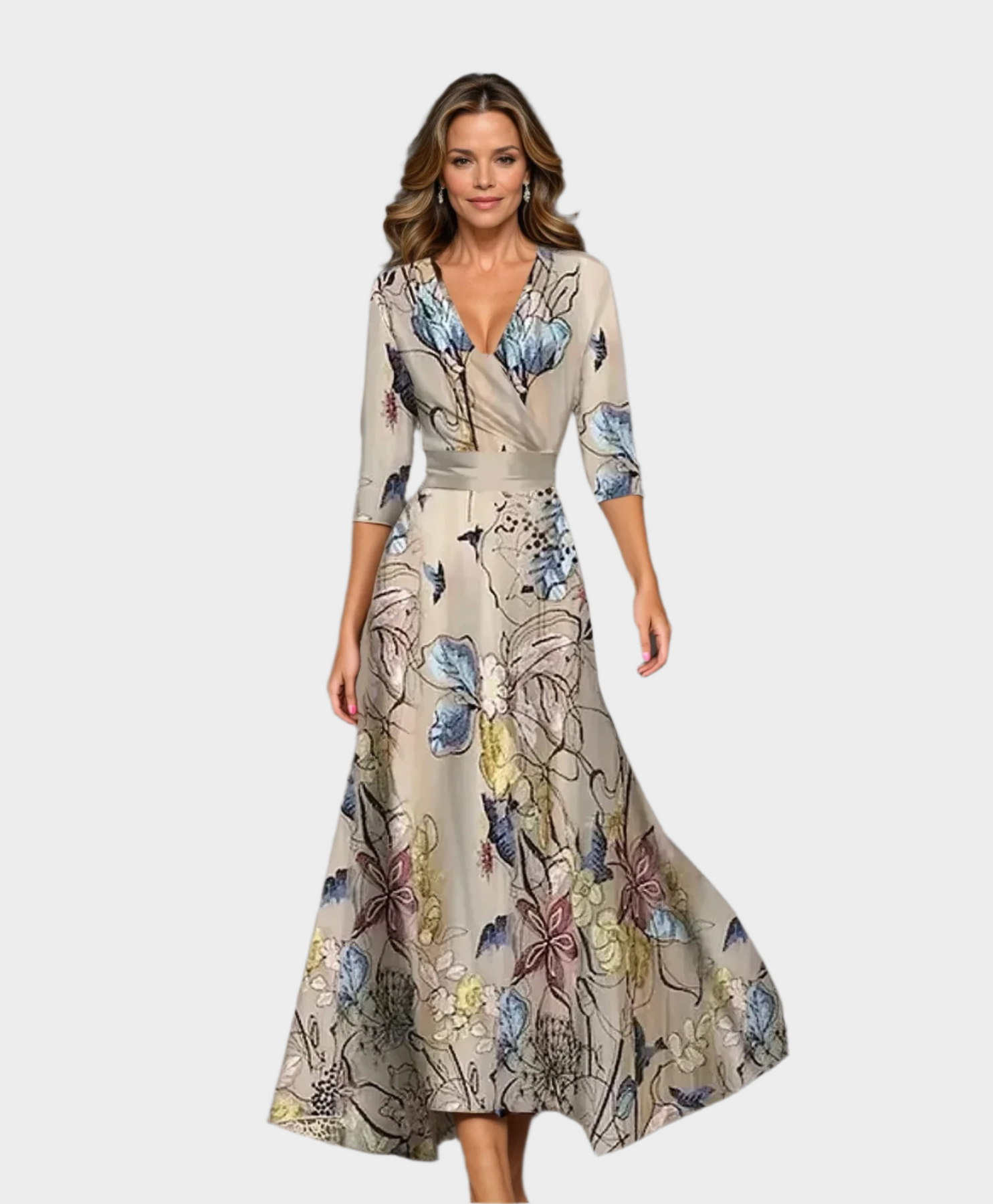 Discover its understated elegance. This midi dress with a V-neckline and three-quarter sleeves combines finesse and comfort, featuring a painted floral design that elegantly highlights the silhouette.