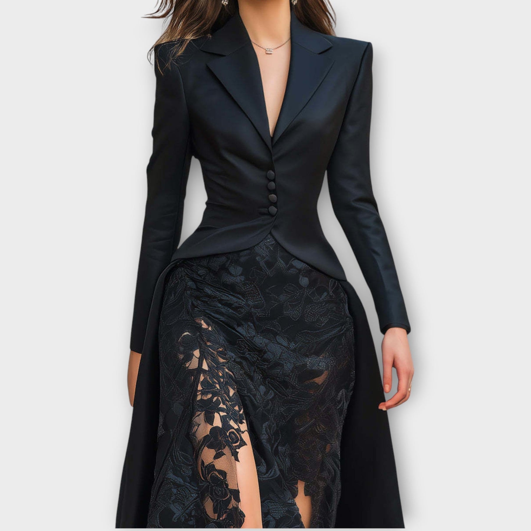 Command attention in the Luxe Satin Lace Gown, a masterpiece of sophistication and allure. Designed to sculpt your silhouette while exuding effortless grace, this gown blends classic tailoring with romantic lace detailing for an unforgettable look.