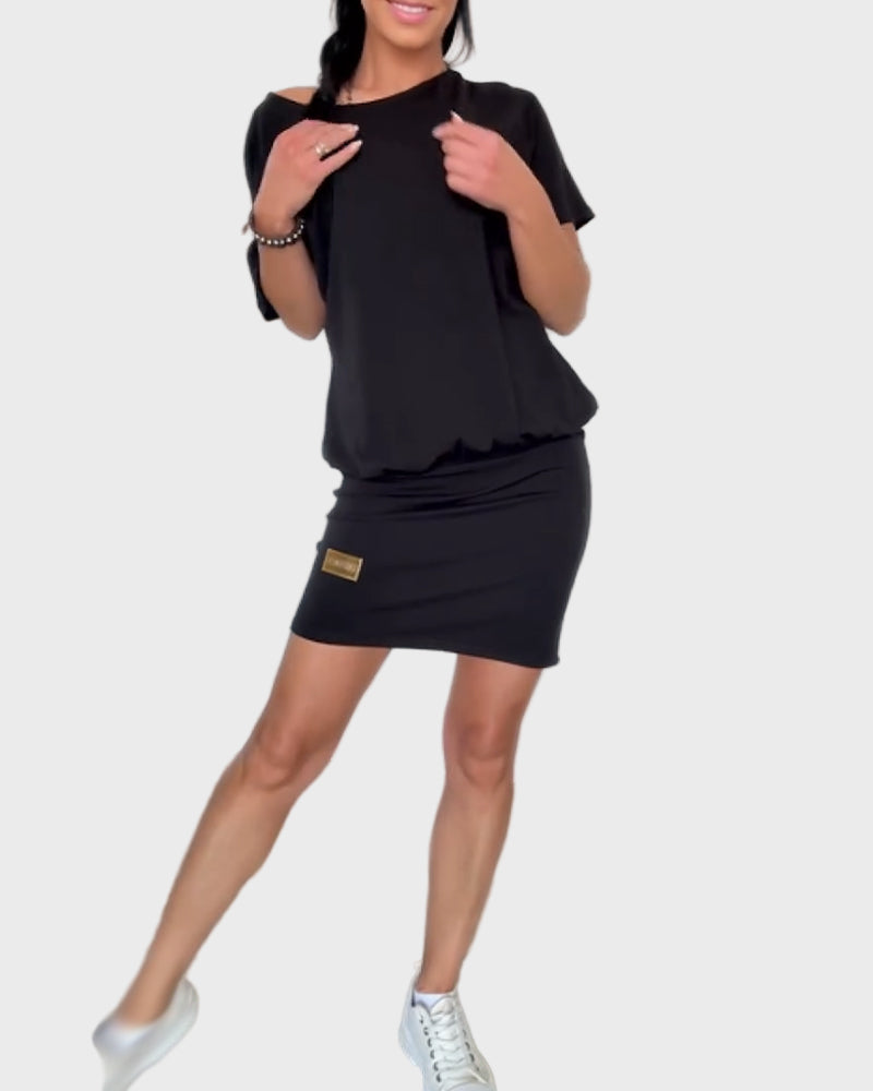 This mini dress in black combines comfort with elegant style. Its relaxed design with short sleeves makes it ideal for everyday wear as well as more casual outings. It pairs perfectly with trainers for a modern and youthful look.