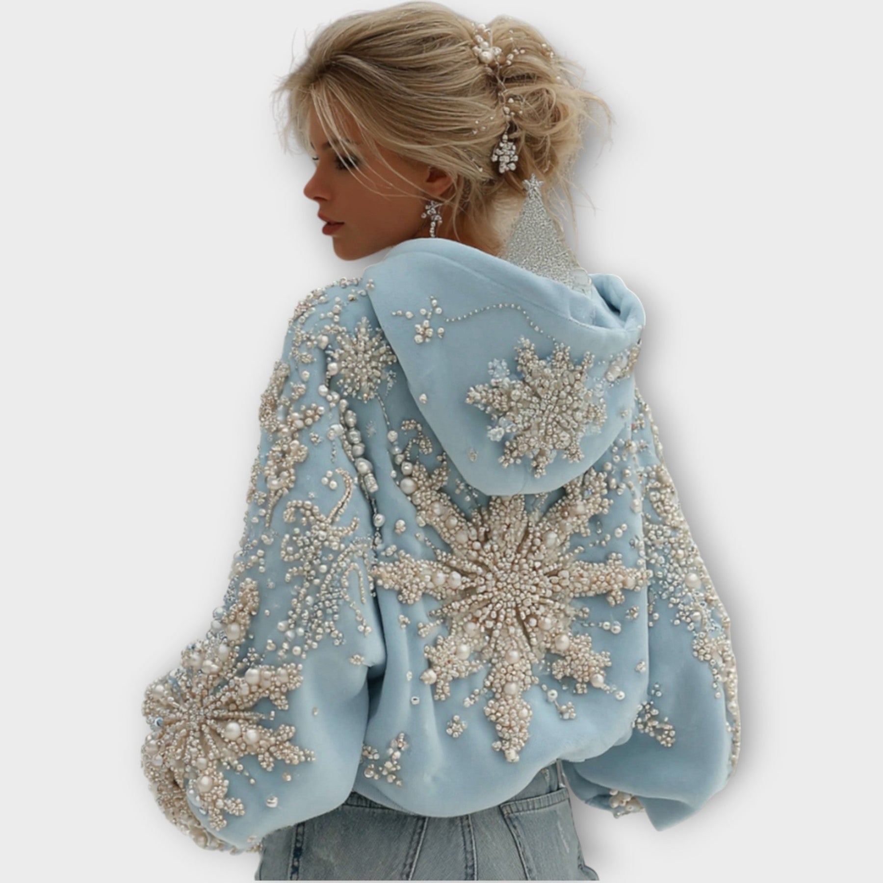 Sparkle through the holiday season in this stunning hand-embellished hoodie, designed with shimmering pearls and crystal accents that feel like freshly fallen snow. Cozy yet glamorous, it’s the perfect statement piece for Christmas celebrations, winter getaways, and magical snowy nights.